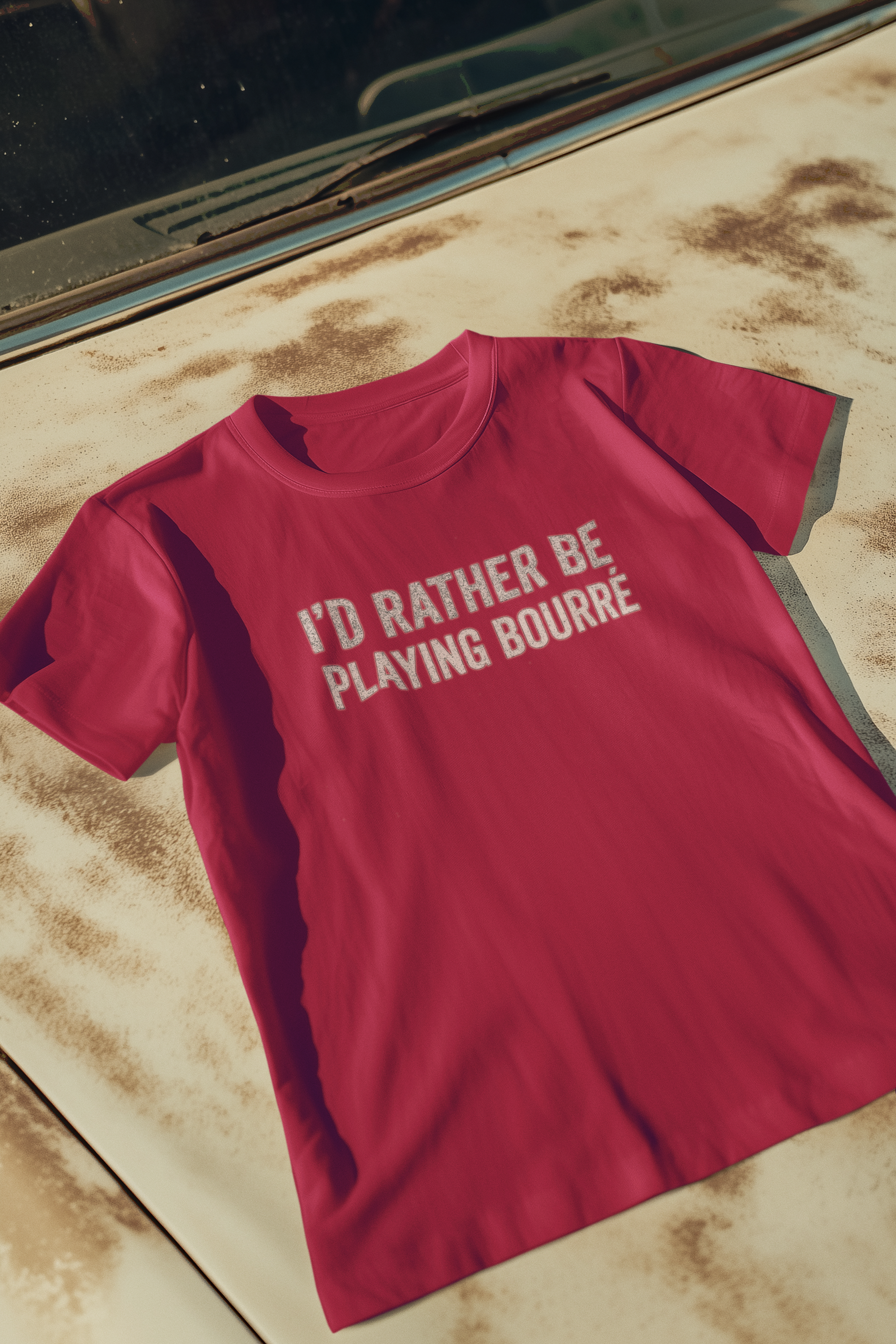 Our I'd Rather be Playing Bourré Cajun t-shirt is crafted to fit like a well-loved favorite, making it the perfect addition to your Cajun apparel collection. Made from 100% Airlume combed and ring-spun cotton, this I'd Rather be Playing Bourré Cajun T-Shirt is lightweight, breathable, and ideal for both active and leisure wear. Key features include: